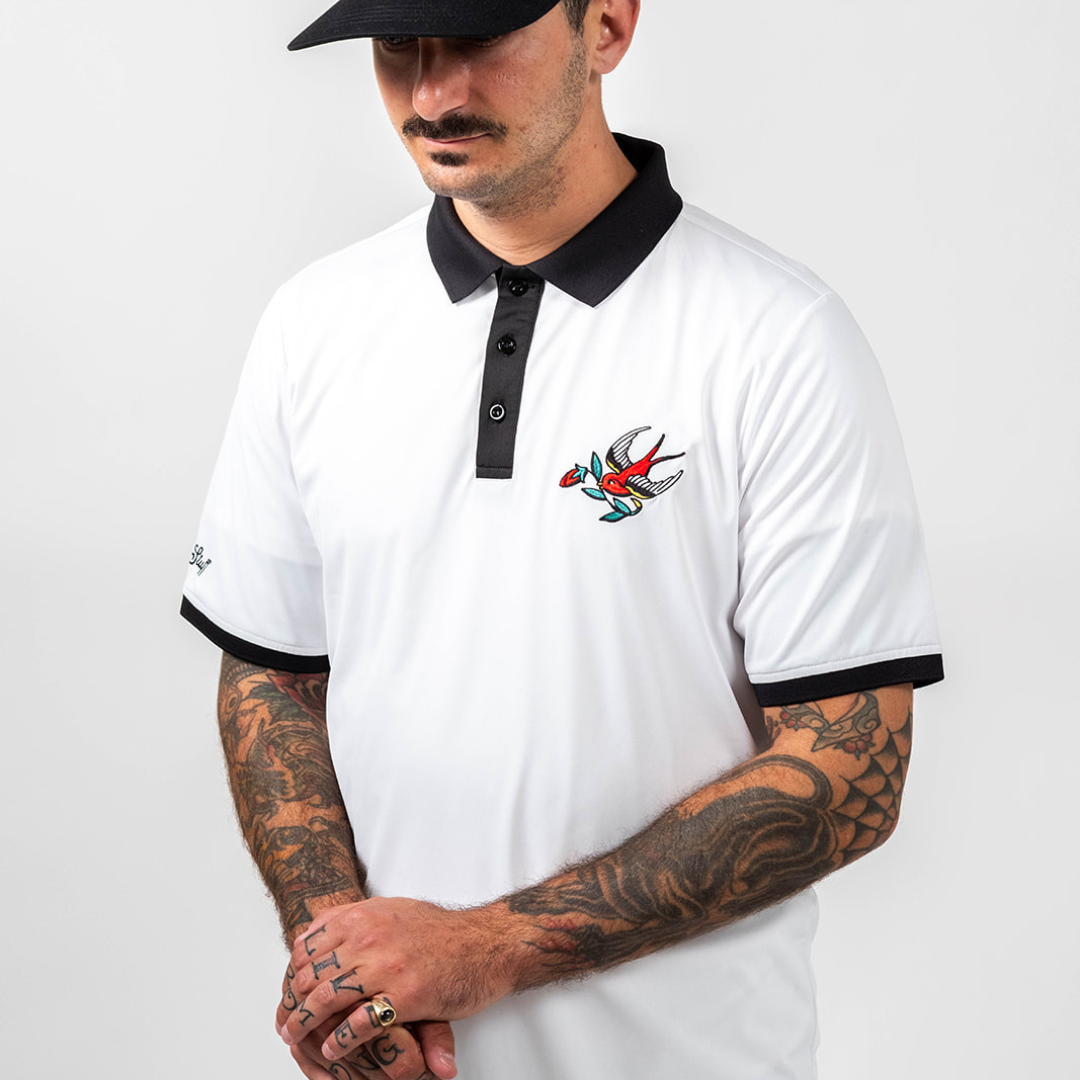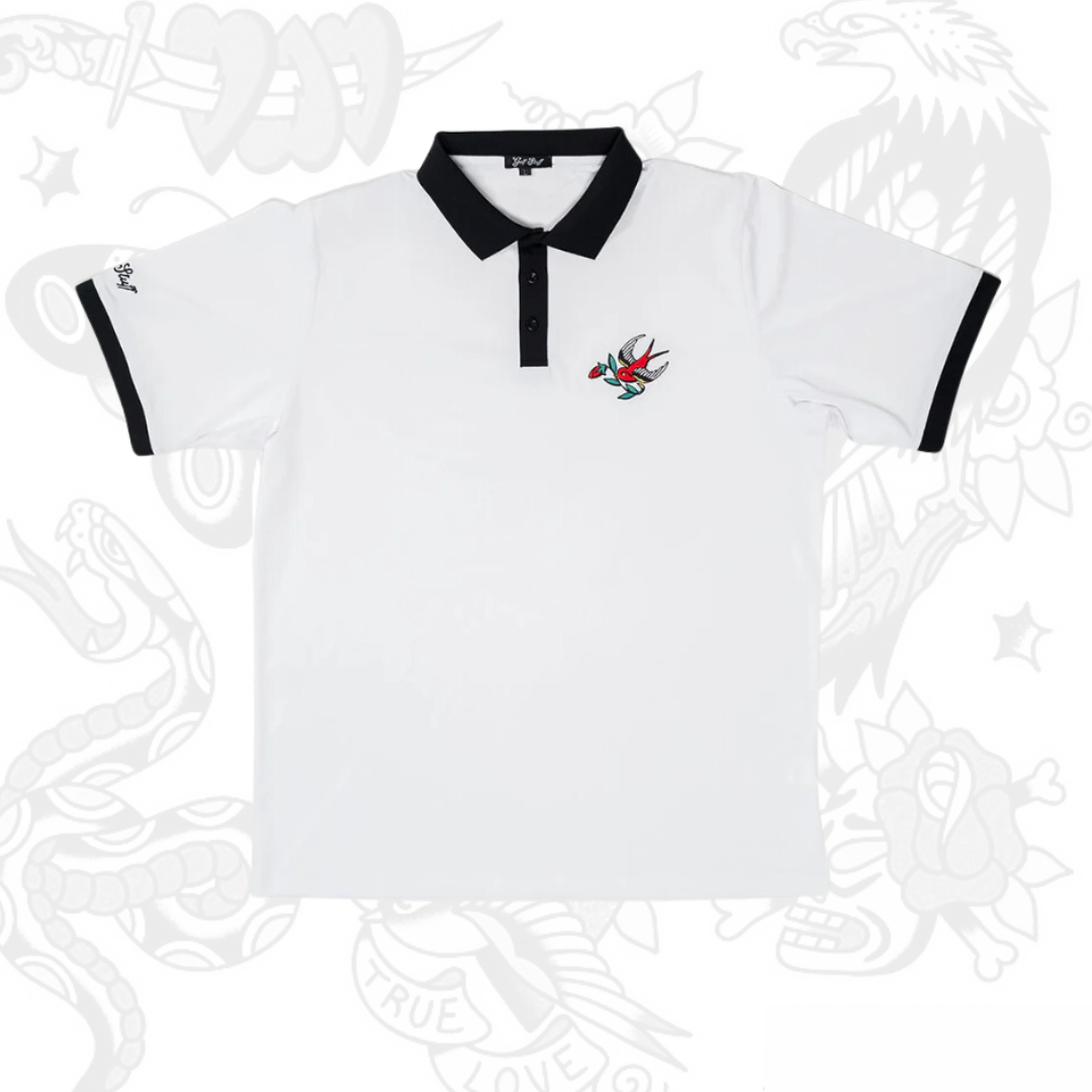 This Traditional Birdie Performance Pique Polo is crafted from 92% polyester/ 8% spandex offering excellent moisture-wicking properties with great breathability to keep you cool and dry during your round. The knit rib collar adds a touch of that classic traditional style, while the cotton neck tape ensures enhanced comfort and durability. Featuring a 3-button closure on the center front placket. Showcasing our Traditional Americana Birdie embroidered on the left chest and the Golf Stuff script embroidered on the left sleeve, this polo blends sophisticated design with performance-focused features.Â