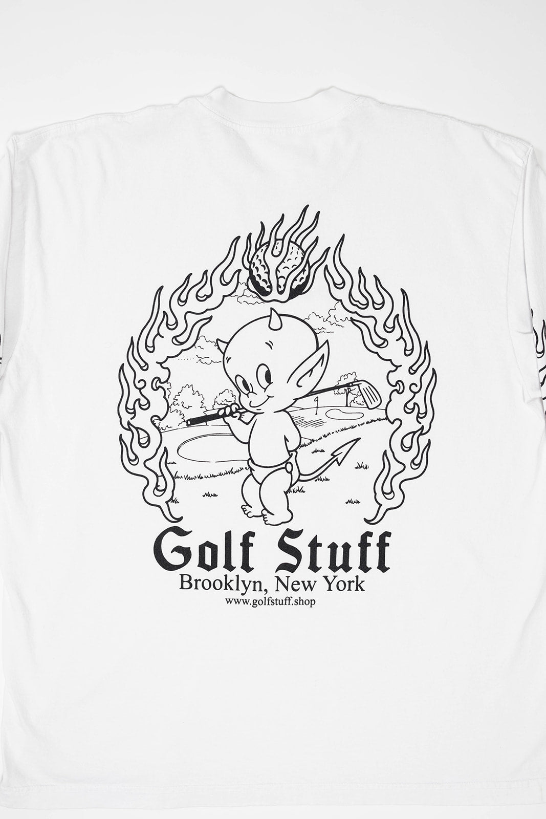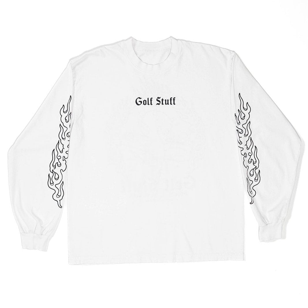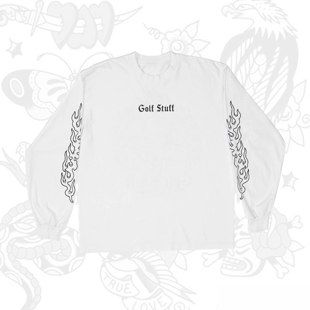Made from 100% cotton, this heavyweight tee features ribbed sleeve cuffs for a relaxed fit. The Golf Stuff alt. logo is screen-printed on the center chest while the Golf Stuff mascot logo is screen-printed on the back enjoying a round of golf with flames screen-printed on the sleeves for a bold touch of branding. Ideal for on or off the course, this long sleeve tee brings together our traditional tattoo roots with classic golf style and laid-back comfort.