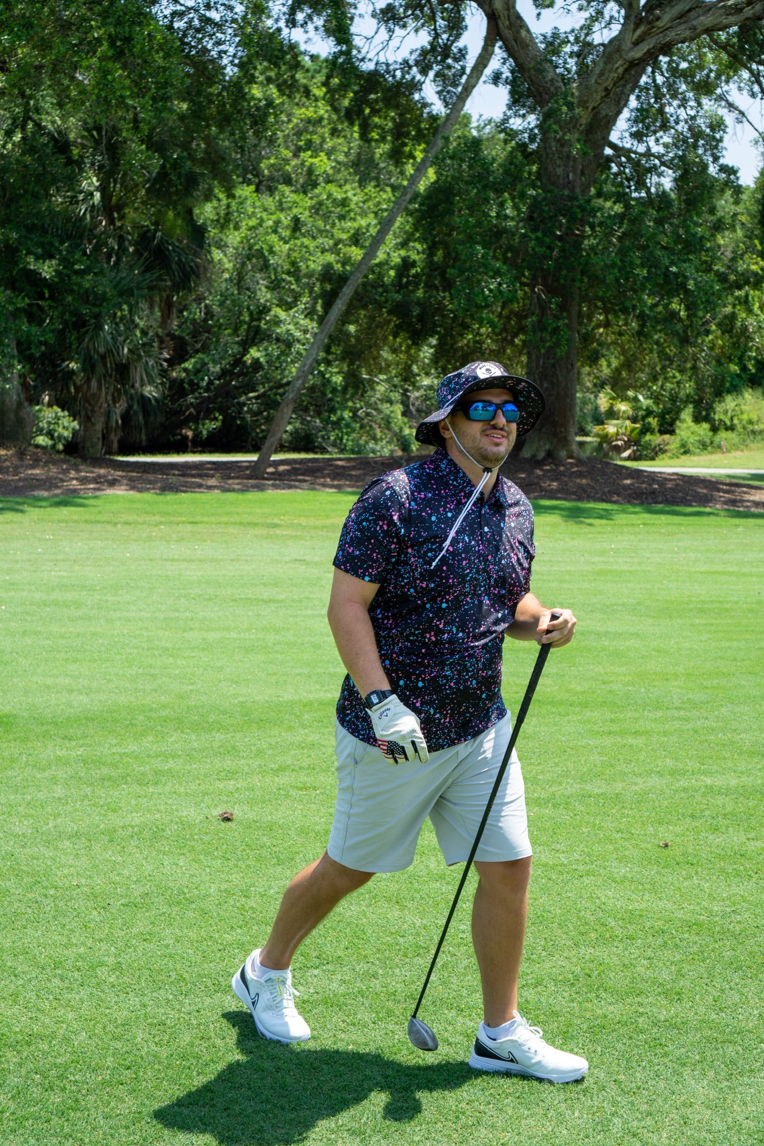Model in the first image with the white background is 6'1 175 lbs and is wearing a size Large. Athletic fit for look good feel good round of golf. Made with 92% polyester and 8% spandex for a nice comfortable flexible shirt.