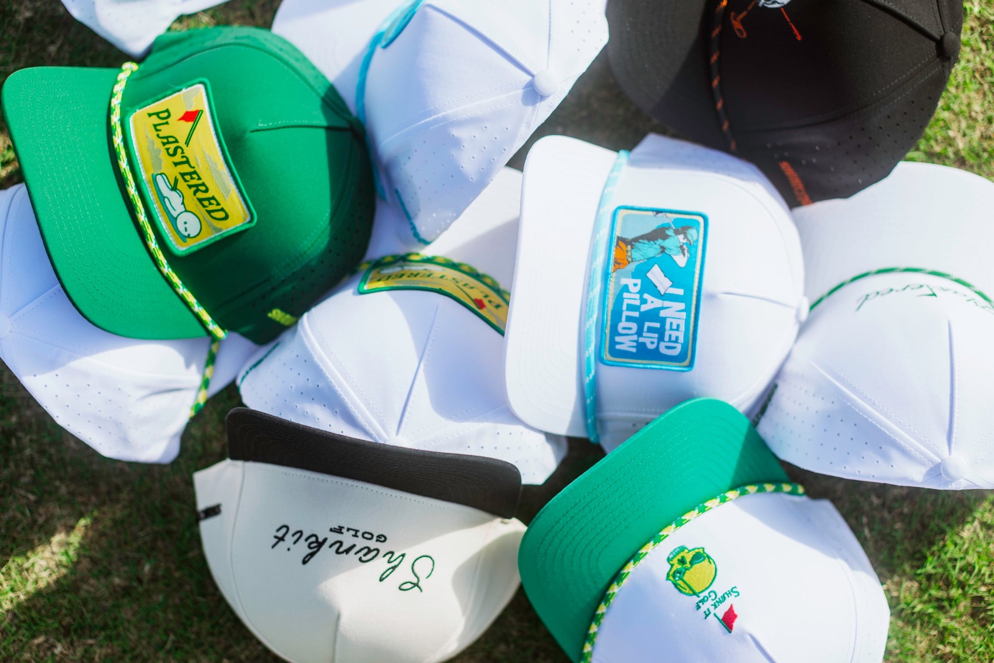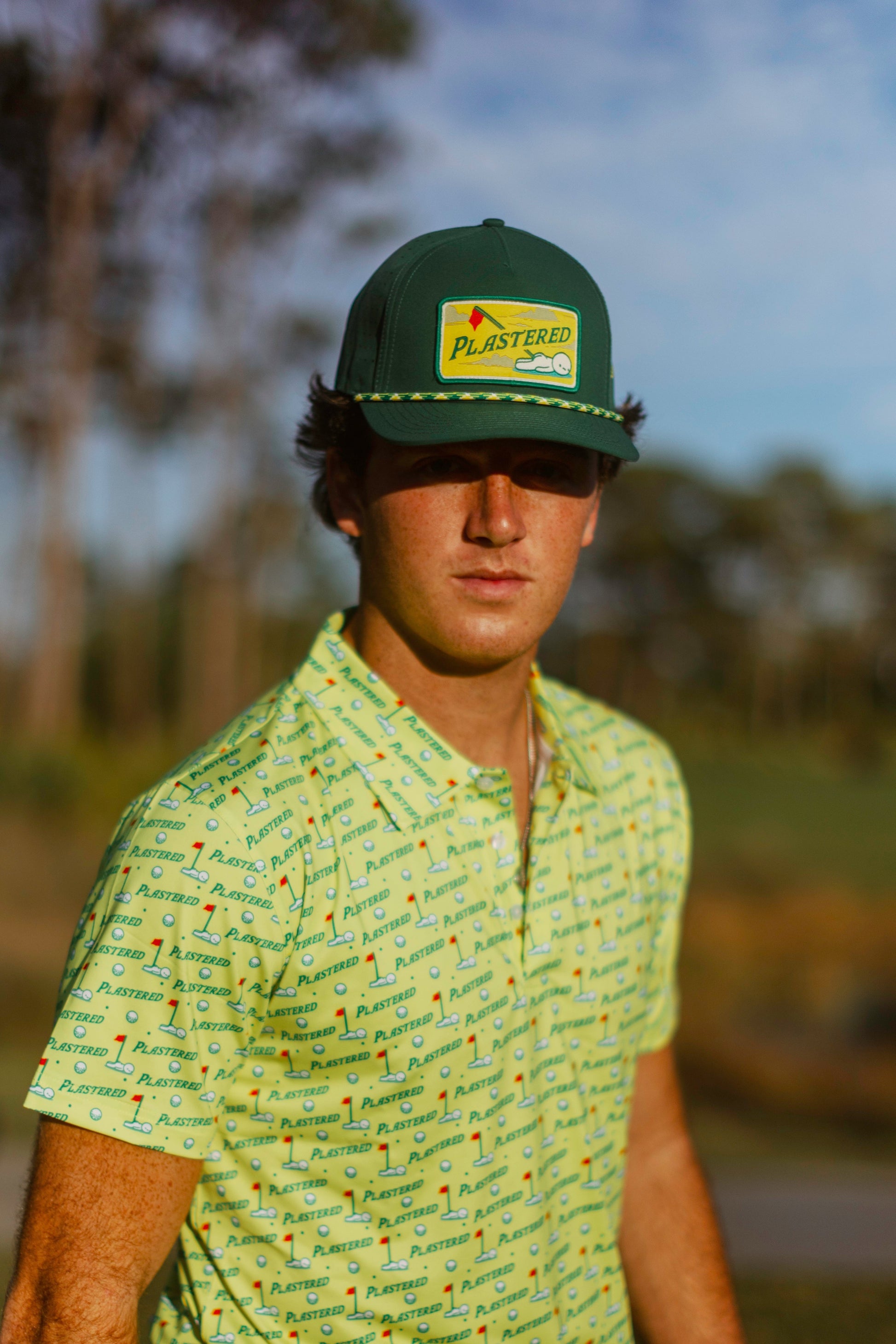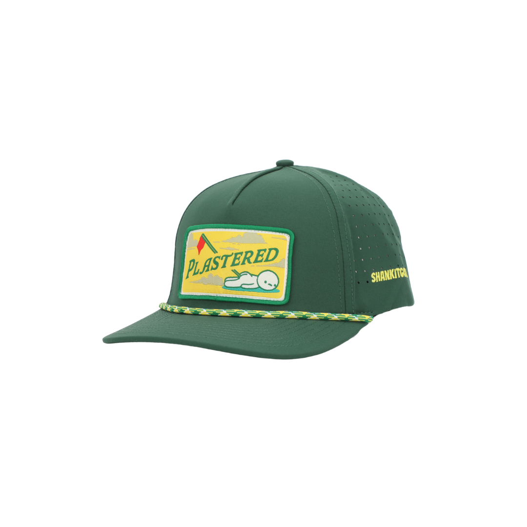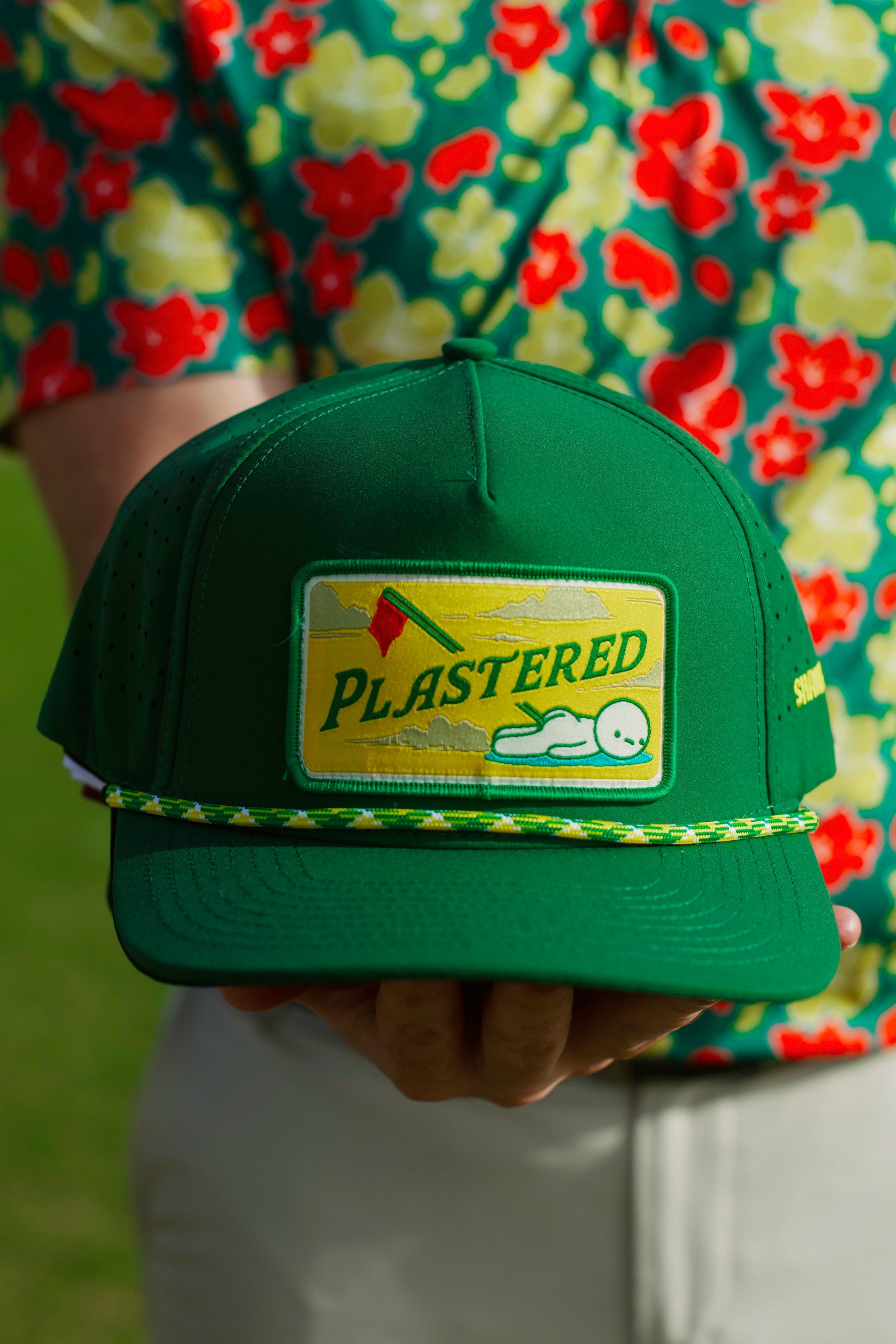 - Rock this comfy blend of 95% Polyester and 5% Spandex that'll hug your head just right! With a snappy snap closure, this Plastered Green Patch Hat adjusts to fit noggins of all sizes. Premium materials mean you'll forget you're wearing it - until someone compliments your awesome headgear on the fairway